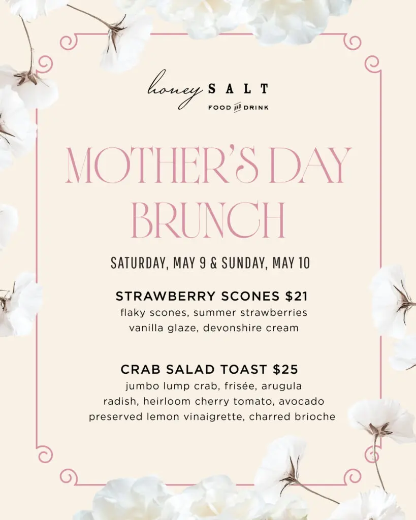 Celebrate Mom at Honey Salt this Mother’s Day! Join us for for special brunch features like our delicious Strawberry Scones or our Crab Salad Toast with beautiful jumbo lump crab and fresh toppings on top of charred brioche.