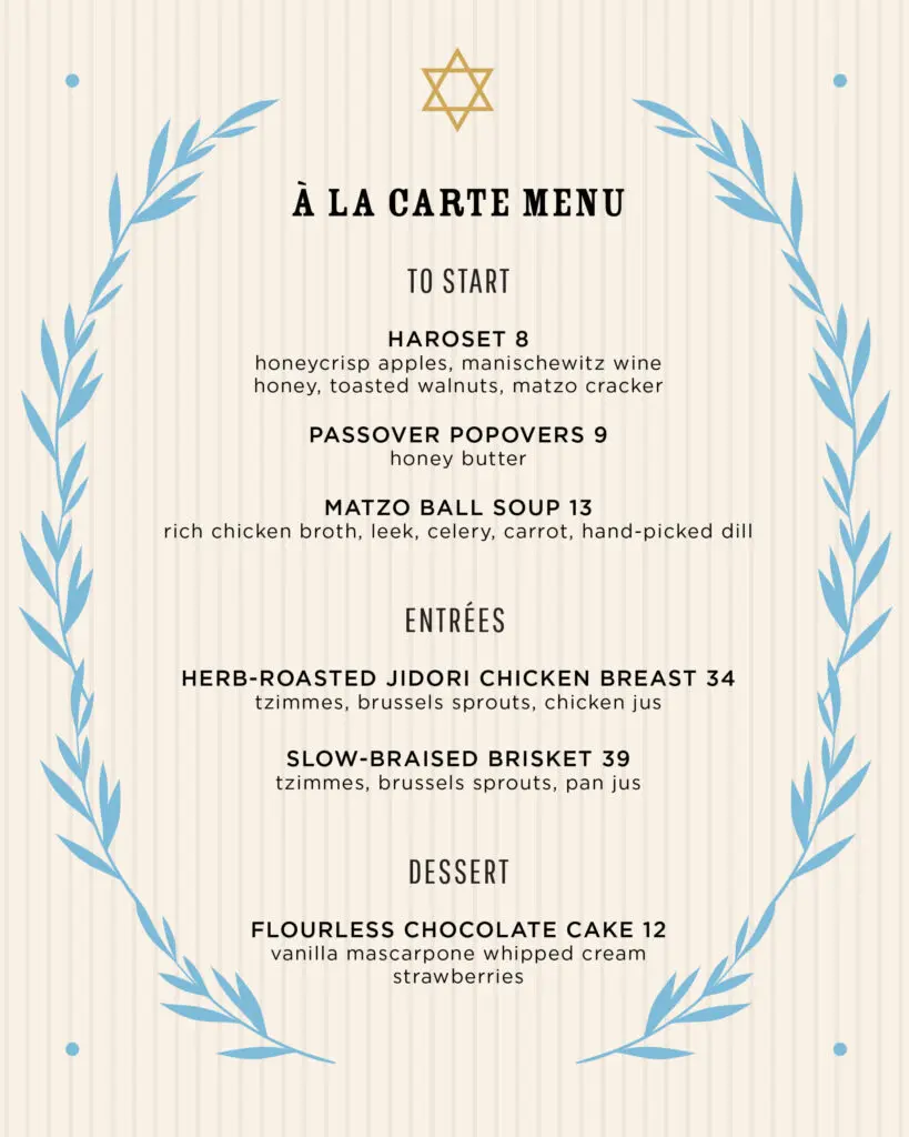 Join Honey Salt for Passover on April 1 & 2, and enjoy traditional favorites like Matzo Ball Soup, Passover Popovers, Haroset, Slow-Braised Brisket and more. Choose to dine in to order from the Passover menu or order the complete dinner for takeout.