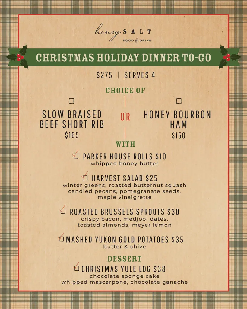 This year, let Honey Salt do the cooking β and you just enjoy the feast. Our Christmas Eve Dinner To-Go is available now for pre-order, arriving just in time for the holidays.